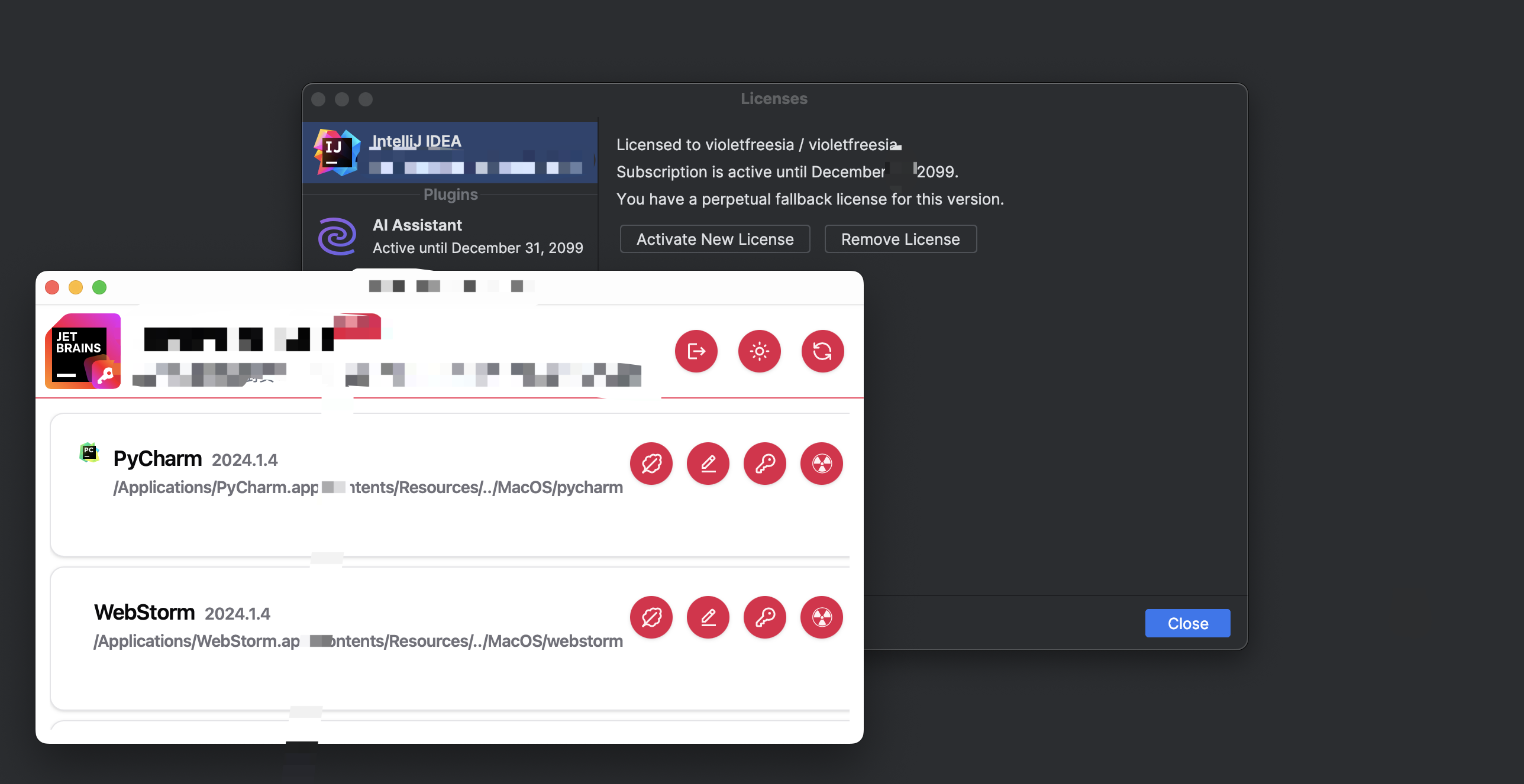 - 获取激活码并粘贴到 JetBrains 全家桶中。