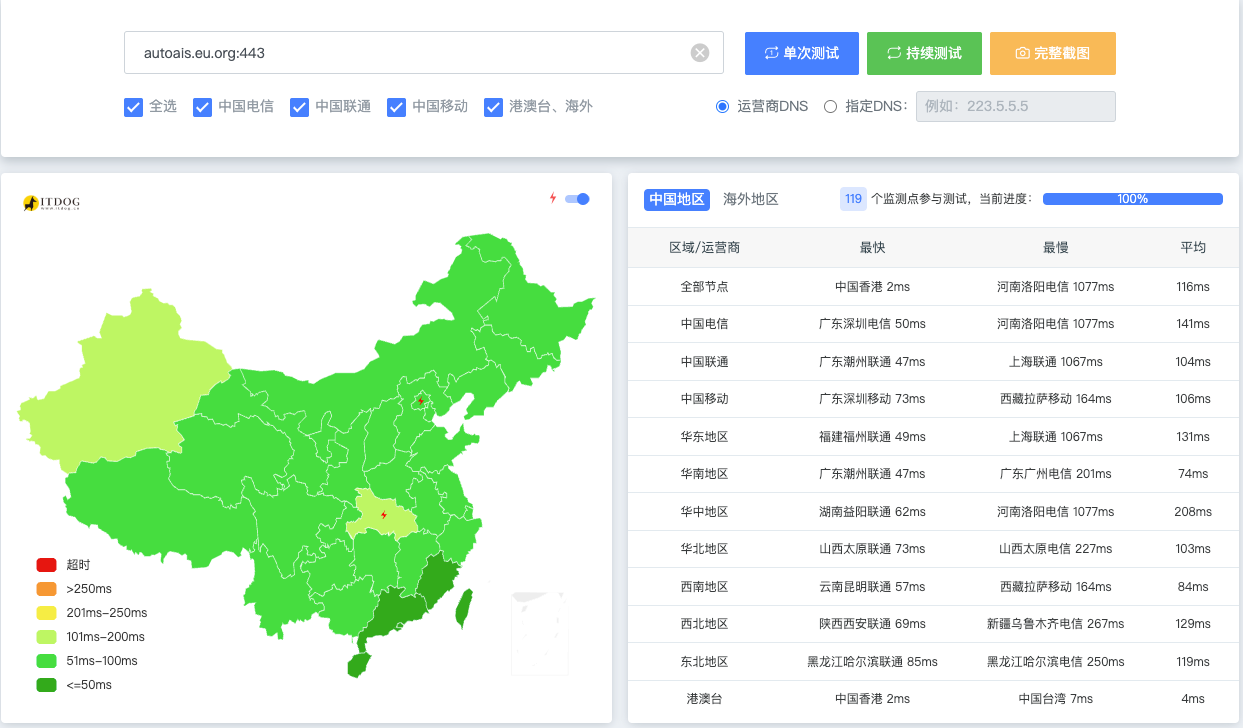 为了验证优化效果,可以使用 itdog 进行测速。通过输入你的项目域名,可以查看访问延迟和连接稳定性。