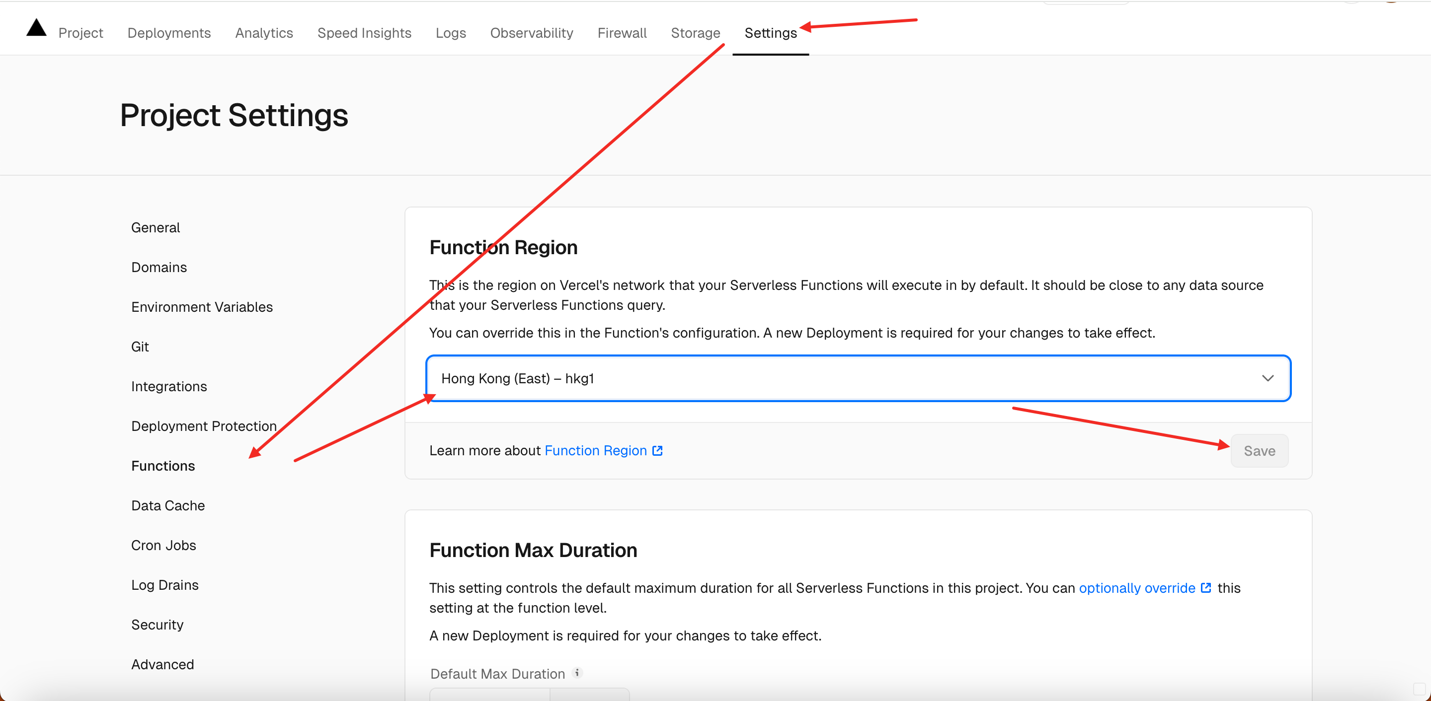 在设置页面中,找到 Functions 部分,点击 Function Region 的下拉菜单,选择 HK 或 JP。这将使你的函数在离国内用户更近的服务器上运行,从而降低延迟。