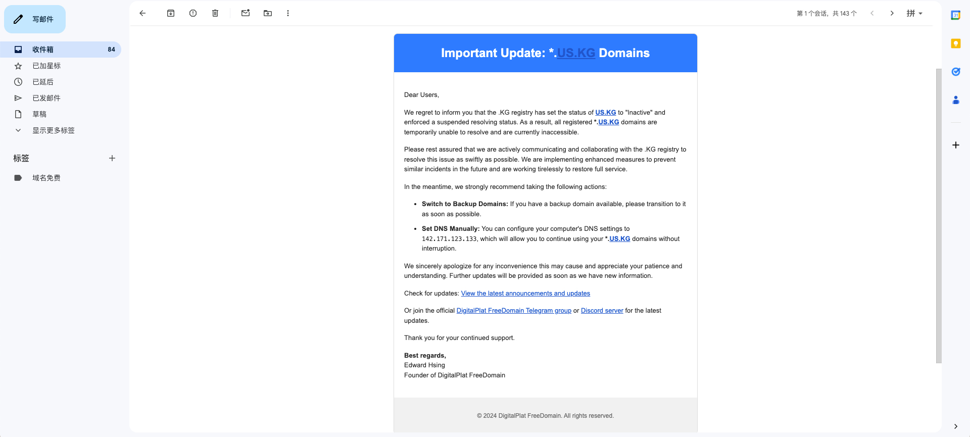 一觉醒来,发现 us.kg 网站挂了。我们先来看一张邮件截图,看看具体情况。