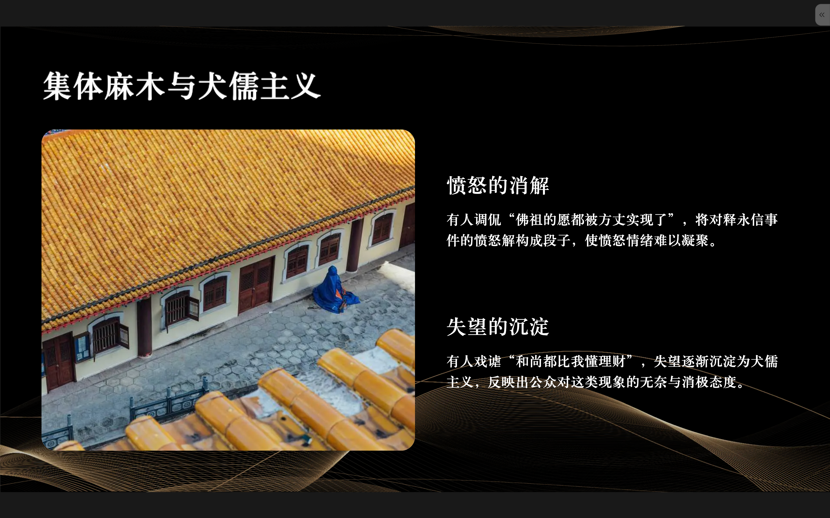 更可怕的是集体麻木:有人调侃“佛祖的愿都被方丈实现了”,有人戏谑“和尚都比我懂理财”——愤怒被解构成段子,失望沉淀为 cynicism(犬儒主义)²⁸。