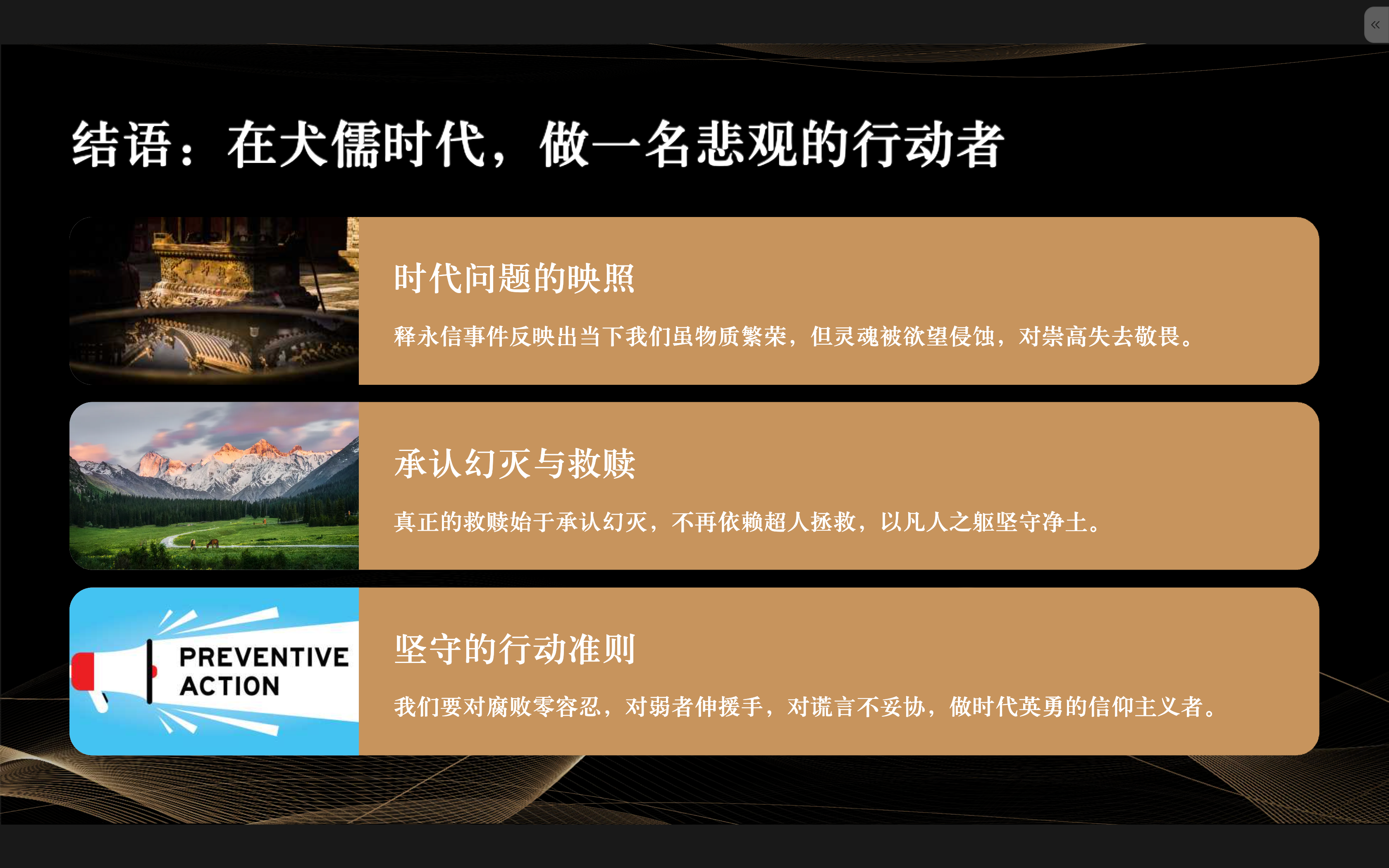 对腐败零容忍,对弱者伸援手,对谎言不妥协。 “看清生活真相后依然热爱生活”,才是这个时代最英勇的信仰主义。