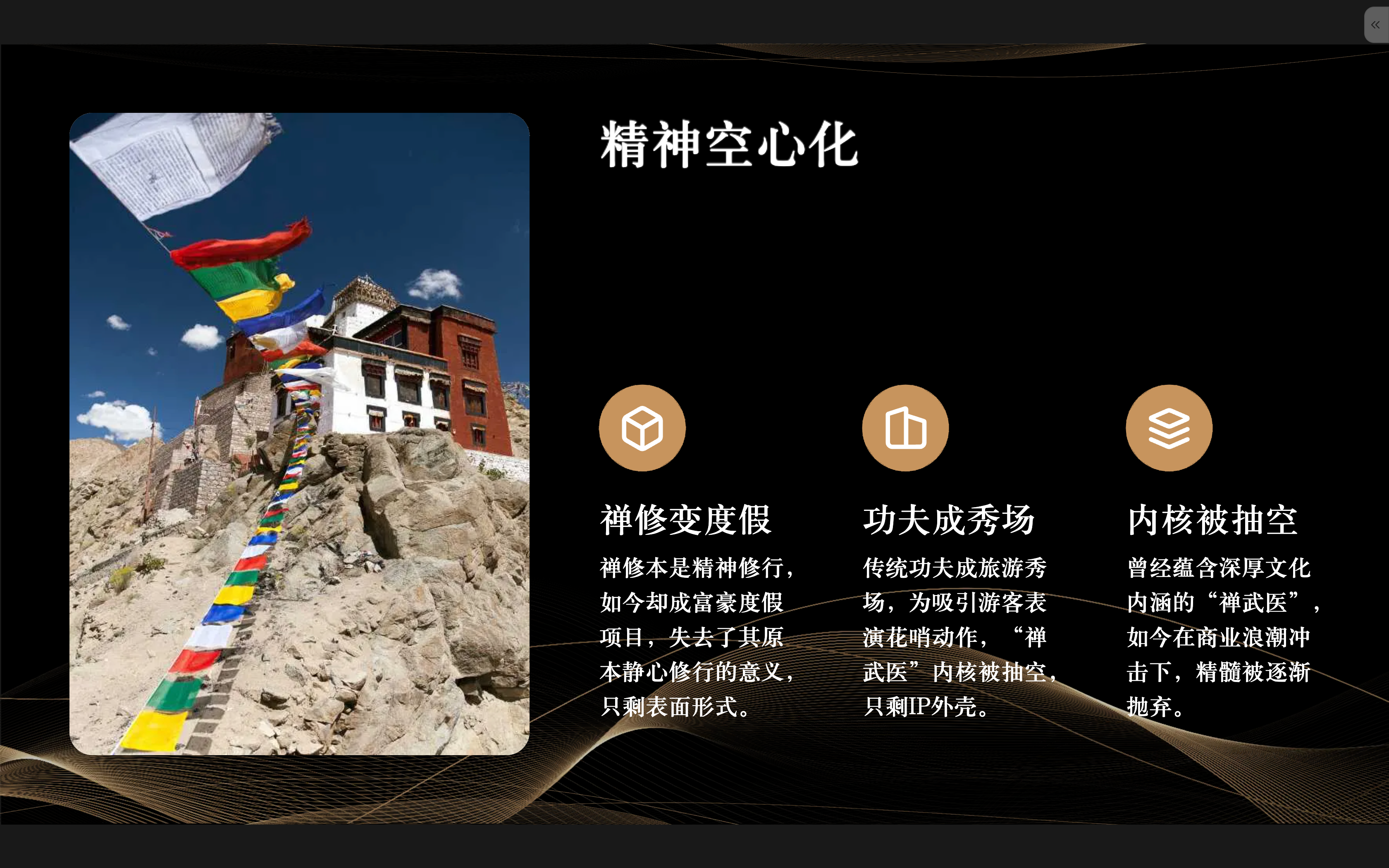 - 精神空心化:禅修变富豪度假项目,功夫成旅游秀场,“禅武医”内核被抽空,只剩IP外壳¹³;